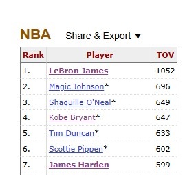 据统计,哈登季后赛生涯失误数来到607次,超越皮蓬,上升至NBA历史第六位,排在他前面的是邓肯。