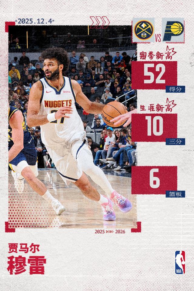 36分钟的登场时间里,贾马尔-穆雷25投19中,三分线外11投10中,狂轰52分,枪管冒火。