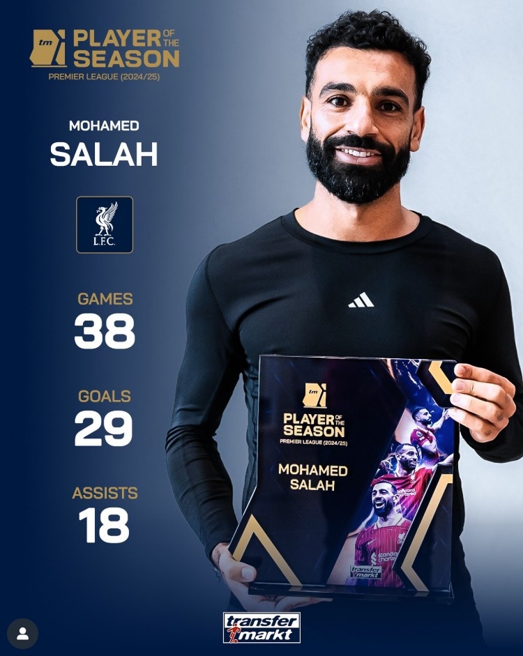星空体育赛事-29球18助,萨拉赫领取德转颁发的上赛季英超最佳球员奖杯