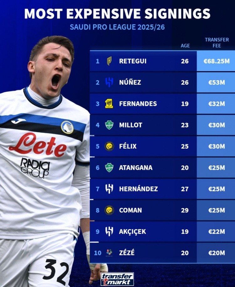 沙特今夏引援榜:雷特吉压努涅斯居首,菲利克斯、特奥、科曼在列